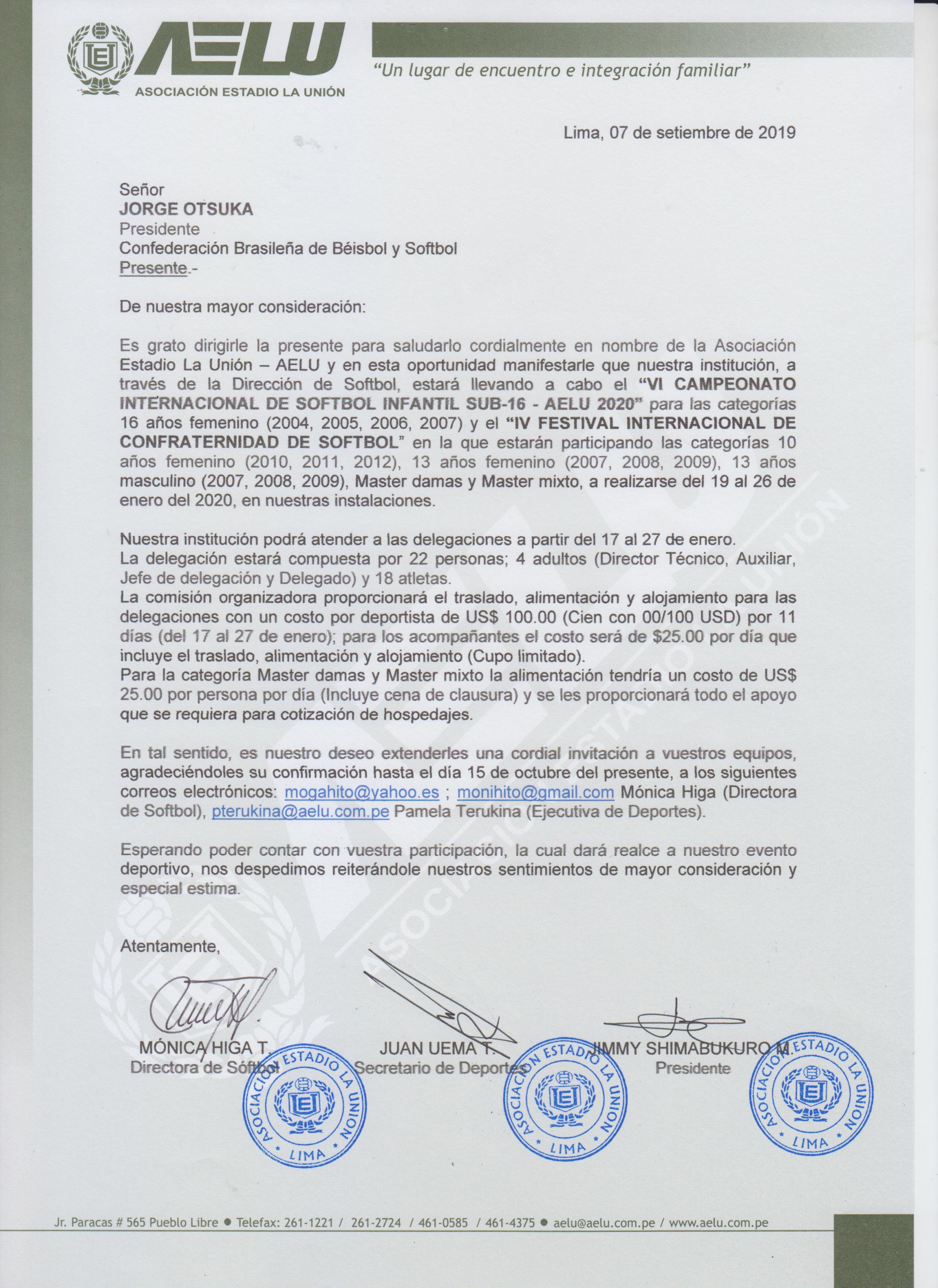 Circular 62-19: Confirmação de Participação – VI Campeonato Internacional de Softbol Infantil Sub16 AELU – 2020