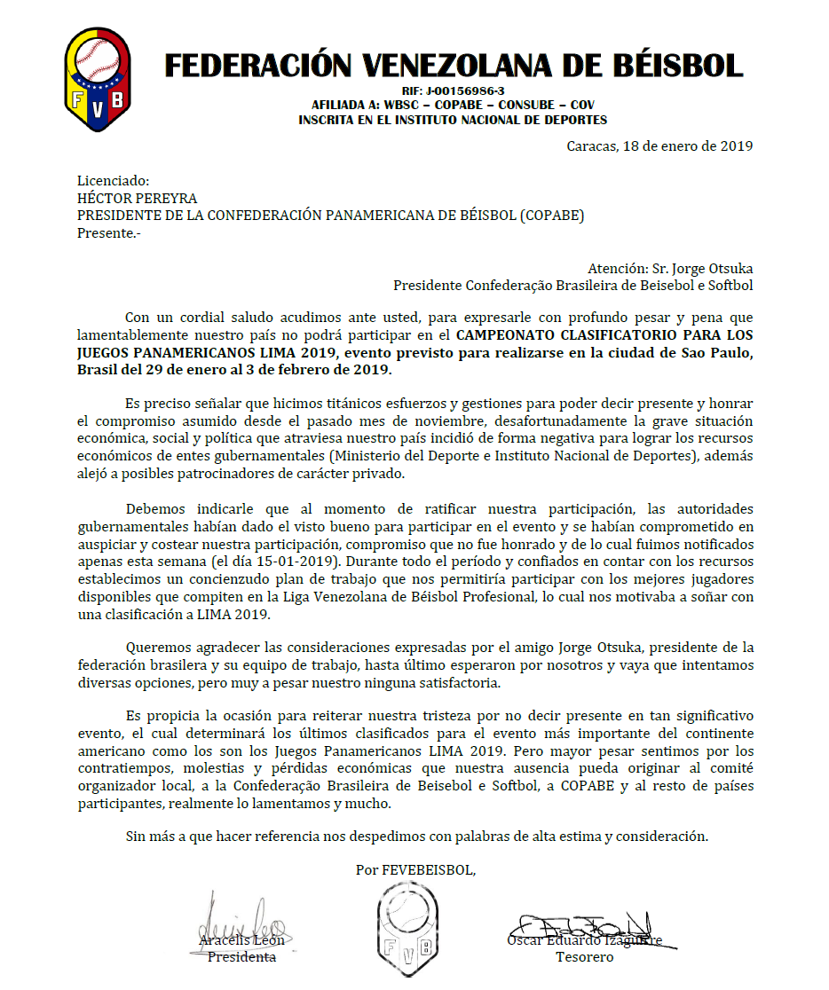 Sobre: Cancelamento de participação da seleção da Venezuela A Confederação Brasileira de Beisebol e Softbol, vem, através deste, comunicar a desistência da participação da seleção da Venezuela no Qualificatório de Beisebol dos Jogos Pan Americanos (Pré Pan 2019), que acontece entre os dias 29 de Janeiro e 03 de Fevereiro, nas cidades de São Paulo-SP e Ibiúna-SP. Através de carta enviada pela FVB (Federação Venezuelana de Beisebol), na última sexta (18), fomos informados da desistência da seleção venezuelana devido a problemas financeiros em viabilizar a vinda e participação da delegação no Pré Pan. Devido ao curto espaço de tempo entre esta data e o início da competição, a vaga não poderá ser ocupada por outra seleção. A decisão sobre como será o sistema de disputa ainda não foi tomada pela COPABE (Confederação Pan Americana de Beisebol). Abaixo, íntegra da carta enviada pela FVB: |