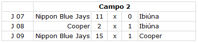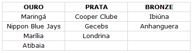 | Classificação Final das Equipes OURO 1º – Atibaia 2º – Marília 3º – Nippon Blue Jays 4º – Maringá PRATA 1º – Gecebs 2º – Londrina 3º – Cooper Clube BRONZE 1º – Ibiúna 2º – Anhanguera |