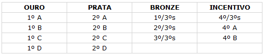 Para o grupo OURO classificarão os campeões de cada grupo. Para o grupo PRATA, classificarão os vices de cada grupo. Para o grupo BRONZE, classificarão os três melhores terceiros colocados e para o grupo INCENTIVO, o quarto terceiro colocado e os dois quartos colocados.