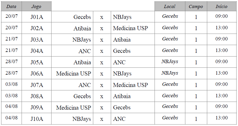 Grupo A (Grande São Paulo): Anhanguera, Atibaia, Gecebs, Medicina USP e Nippon Blue Jays