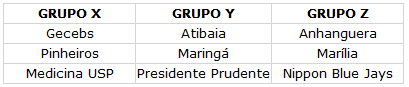 Grupo A (Grande São Paulo): Anhanguera, Atibaia, Gecebs, Medicina USP e Nippon Blue Jays (Placares da Primeira Fase: Rodada 1Rodada 2 e Rodada 3)