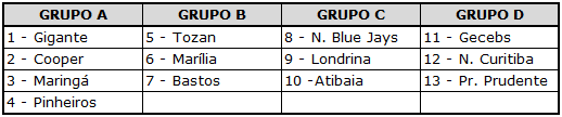 Atibaia, Bastos, Cooper Clube, Gecebs, Gigante, Londrina, Marília, Maringá, Nikkei Curitiba, Nippon Blue Jays, Pinheiros,  Presidente Prudente e Tozan.