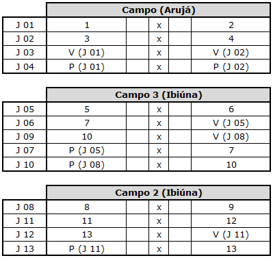Em caso de chuva, uma nova tabela será definida pela Comissão Técnica em função do volume da chuva, do dia e da hora que chover, das condições em que os campos se encontrarem, dos jogos já realizados, etc. Quando chover, as equipes deverão ficar atentas às possíveis mudanças na tabela de jogos.