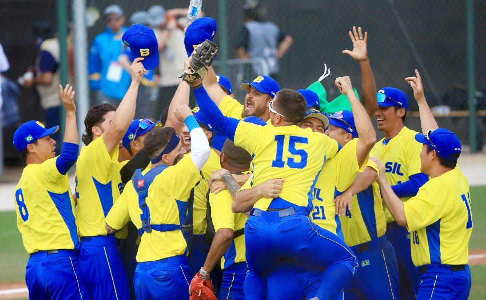 O Brasil abriria o mrcardor logo na primeira entrada com o home run solo de Victor Coutinho, o primeiro nos Jogos. Mesmo chegando em base nas demais entradas, o desenrolar da partida veio com a entrada de Osvaldo Carvalho, entrando com rebatedor de emergência. Osvaldinho com uma rebatida dupla impulsiona as corridas de Lucas Sakay, Lucas Rojo e Fábio Murakami. O próprio anotaria a quinta corrida, impulsionado por Pedro Ivo Okuda.