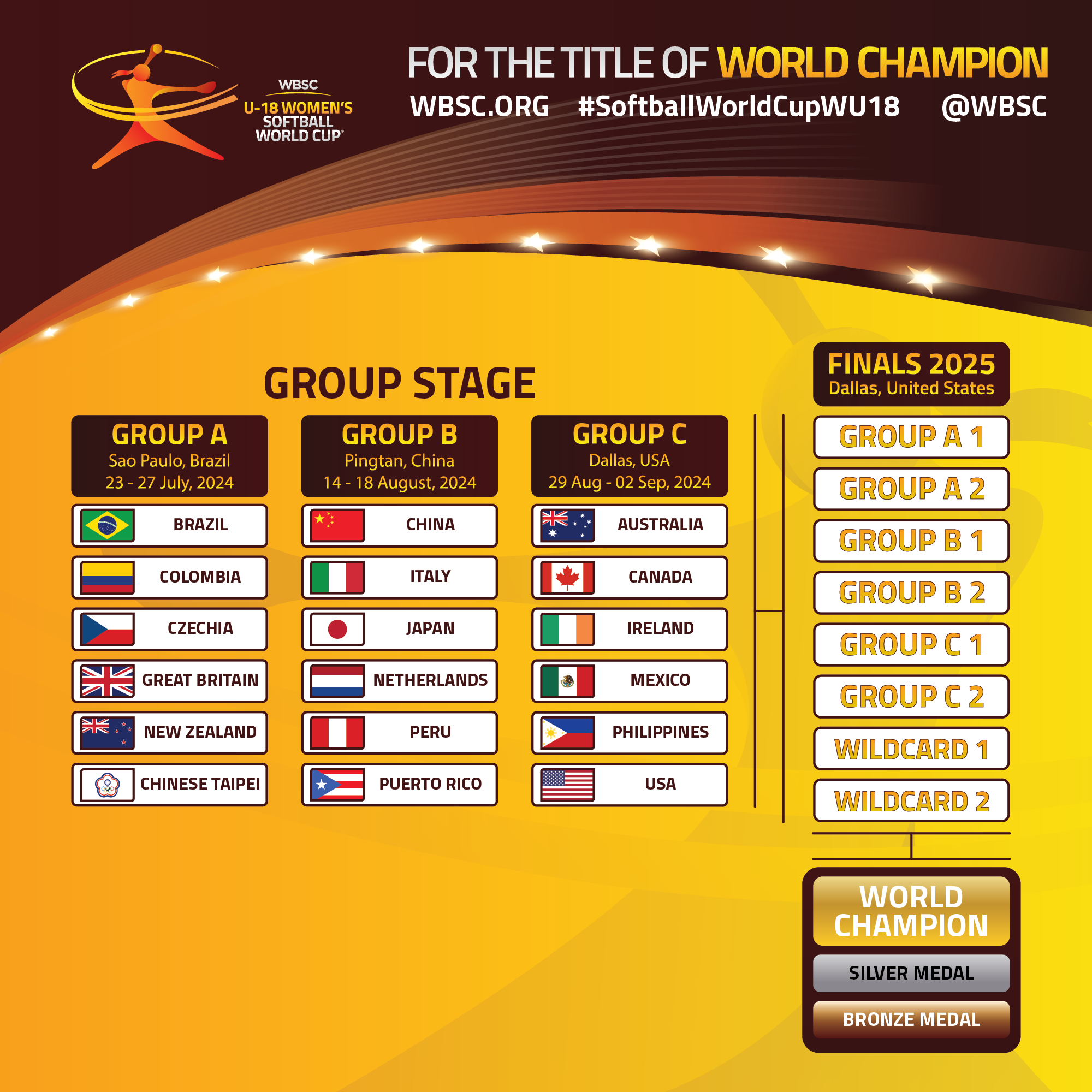 Nesta quarta (17), a WBSC (Confederação Mundial de Beisebol e Softbol) divulgou os grupos e seleções definitivos da Fase de Grupos da Copa do Mundo de Softbol Sub18 – 2024, que terão as cidades de São Paulo, Pingtan, na China, e Dallas, nos EUA, como sedes.