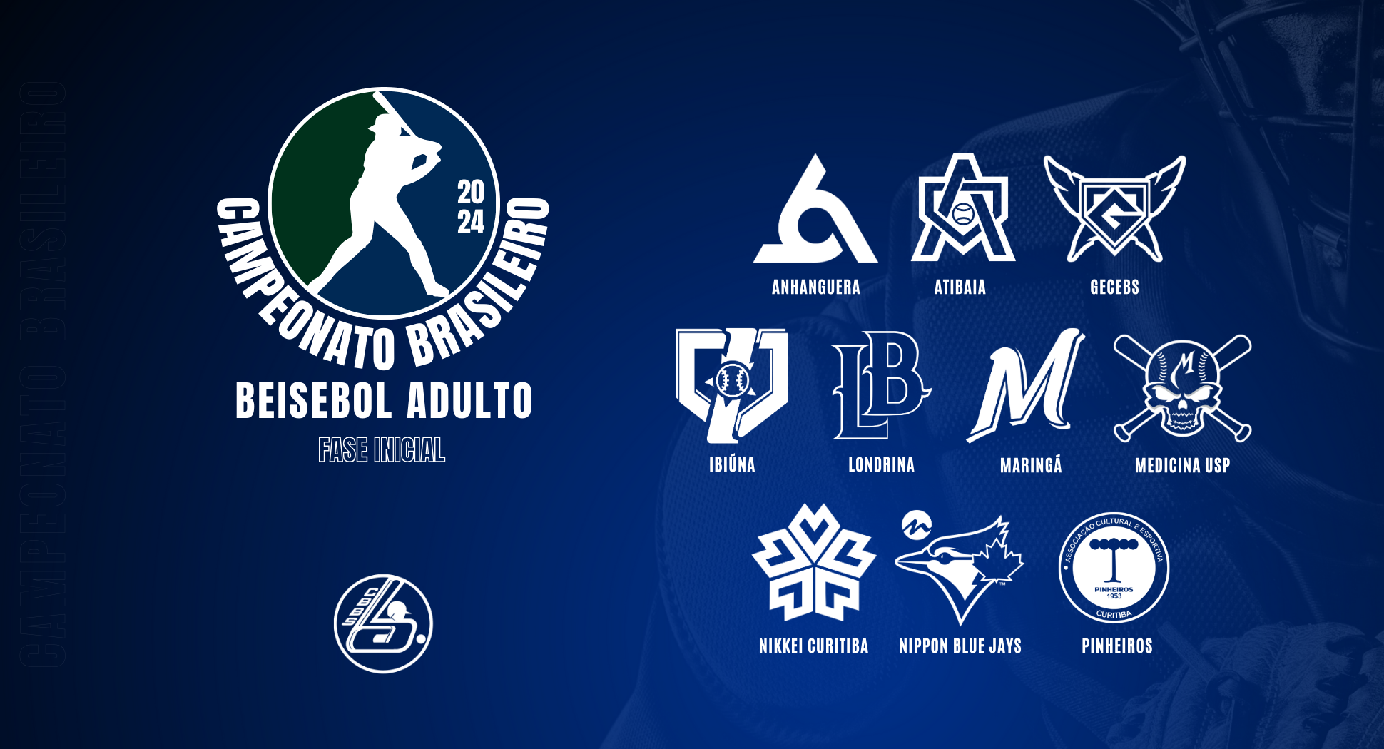 Nos dias 06, 07, 20, 21, 27 e 28 de Julho de 2024 acontecem os jogos da Fase Inicial do Campeonato Brasileiro de Beisebol Adulto – 2024, contando com Anhanguera, Atibaia, Gecebs, Ibiúna, Londrina, Maringá, Medicina USP, Nikkei Curitiba, Nippon Blue Jays e Pinheiros